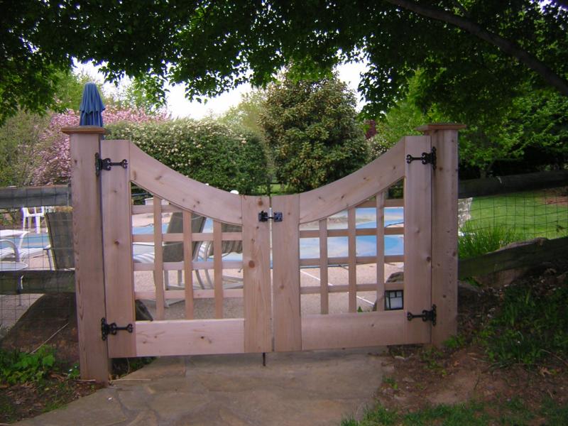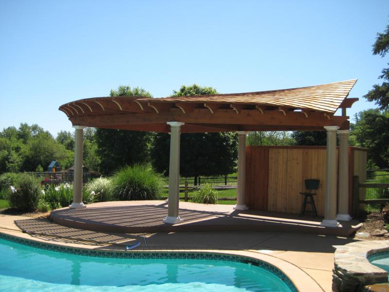 Pool house with changing room, bar, cedar shake roof, stucco, pergola, deck, and lattice fence to hide pool equipment.